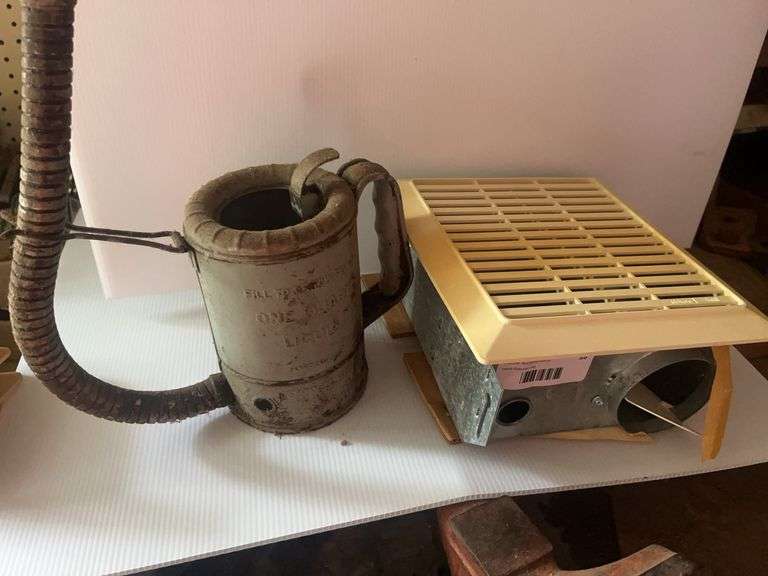 Includes a metal one quart liquid container with a flexible spout and handle, along with a vintage Broan vent fan.