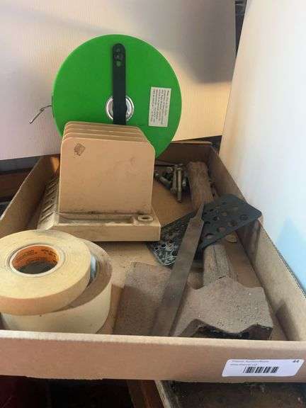 Including rolls of tape, a green measuring tape reel, some wood working tools, metal fasteners, and other hardware items.