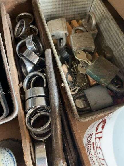Collection of various tools, locks with keys, metal hardware, funnels, and spray bottles.