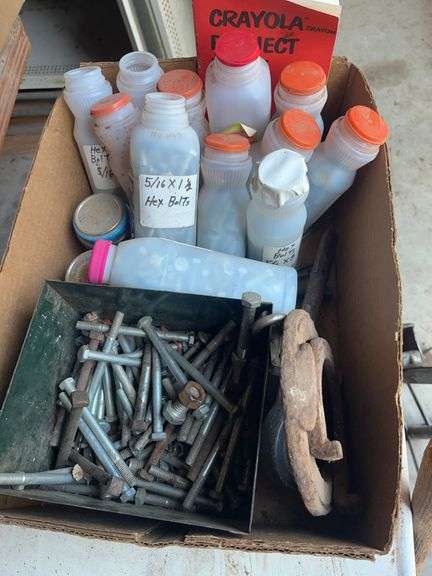 LOT 149 - Box of Bolts, Project Book, and Bottles
