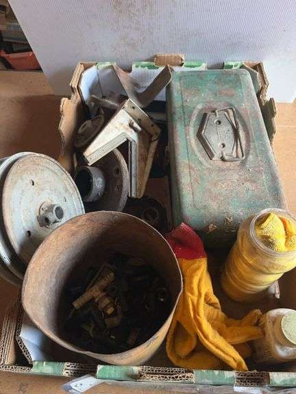 Includes pulleys, metal brackets, hoses, a metal container, and an assortment of small hardware pieces.