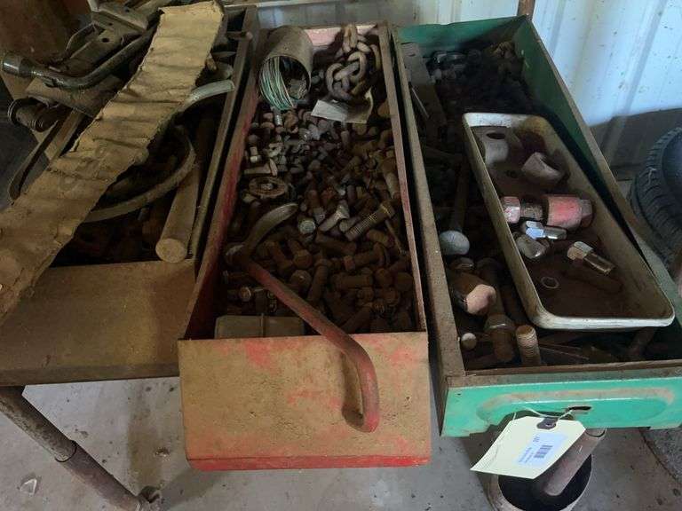 A collection of various nuts, bolts, chains and assorted hardware housed in multiple metal toolboxes.