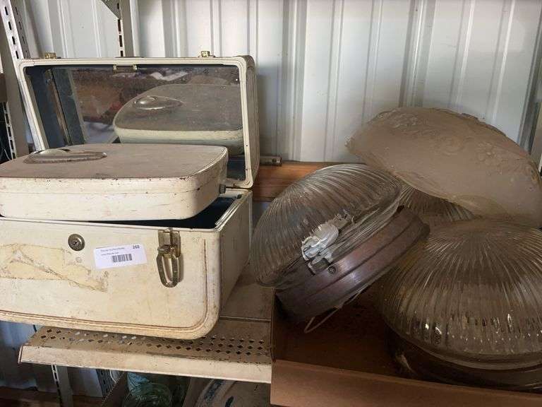 This lot includes a selection of lighting fixtures featuring different glass patterns and a retro suitcase. The lighting fixtures are likely for decorative purposes and the suitcase provides a nostalgic feel.