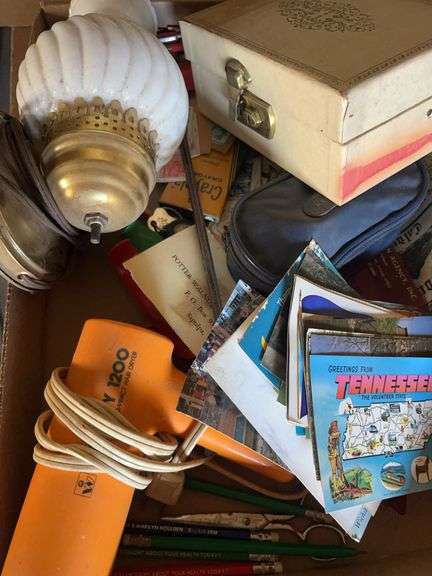 A mixed box lot containing a variety of items including postcards, an electric razor, a lamp component, pencils, a jewelry box, and other miscellaneous items. Please review the images for the details of what is included.