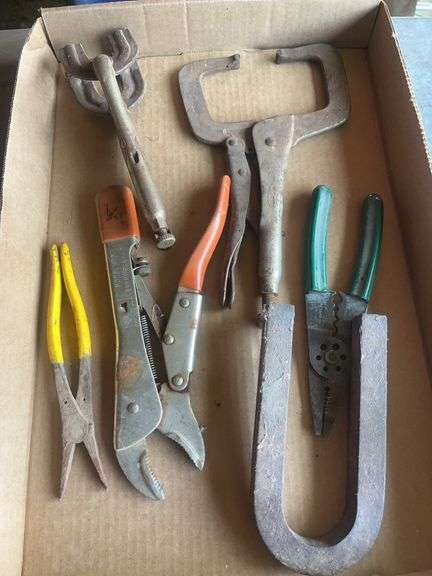 Collection of various hand tools including pliers with yellow and green handles, several clamps, and other tools as shown.