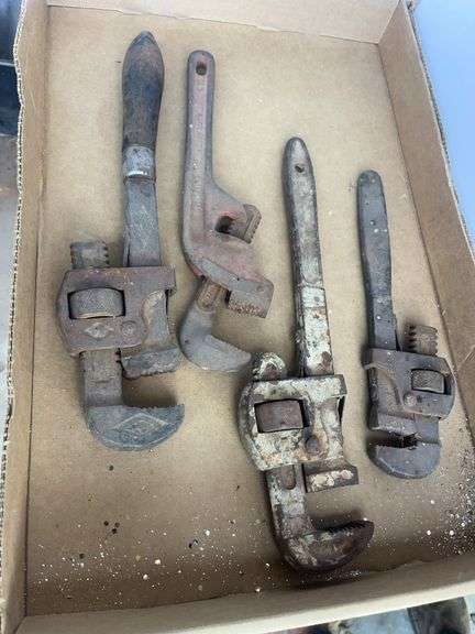 4 pipe wrenches of varying sizes. These tools show signs of use and wear and are ready for your next project.