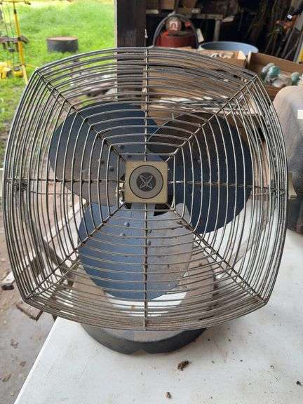 This is a General Electric oscillating fan. It has a metal cage and a blue blade. It is electric and features a knob to adjust speed.