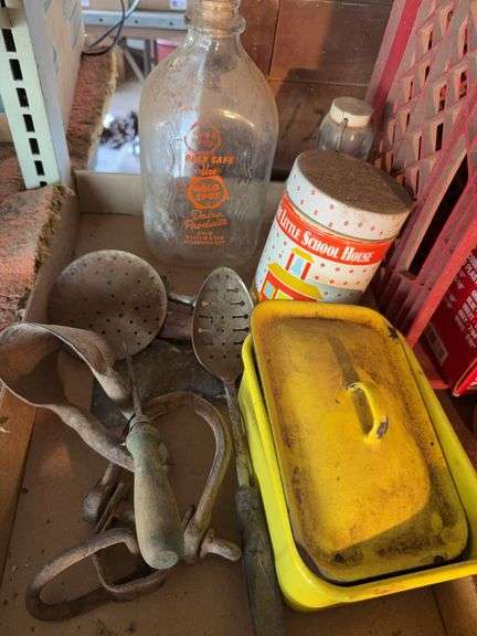 Glass dairy bottles, metal kitchen utensils, a 'Little School House' themed tin, a yellow enamelware container, and a variety of metal hardware. A great assortment of interesting finds.