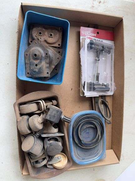 Includes a variety of hardware items such as furniture feet, metal plates, casters, rubber rings, and a Hyper Tough 7-piece tire plug kit.