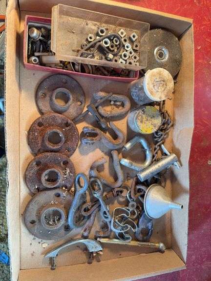 Hardware, fittings, and supplies. Includes metal flanges, hooks, chains, nuts, bolts, screws, and other assorted items.