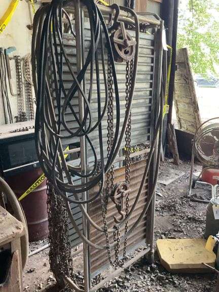 Metal framed rack, including chains, multiple hoses, and pulley systems. Useful for a variety of garage or industrial applications.