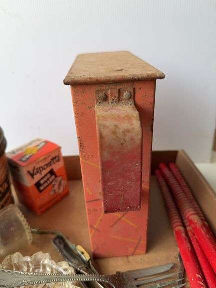 Metal advertising tins (Velva-Kleen, Flakes, Suds), silverware, glass ashtrays, a Daughters of the American Revolution (DAR) plaque, and Vaporette bug killer. A great assortment for collectors or those looking for unique items.