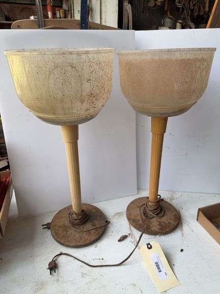 Two standing lamps, approximately 22 inches in height. Each lamp features a distinctive shade and a round metal base. They would need some cleaning.