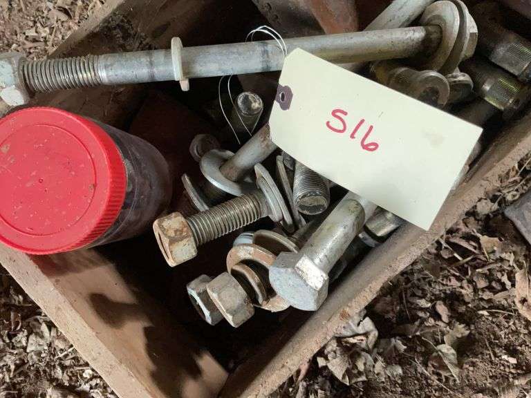 A lot of various bolts, fasteners, and hardware in a wooden box. Includes a red-lidded container with more small parts and a heavy wedge-shaped metal piece.