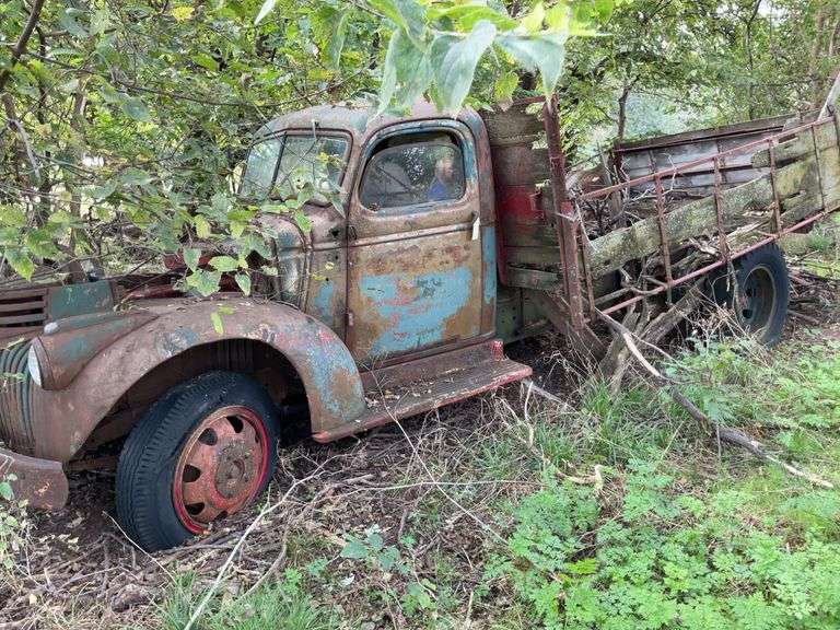 This listing is for a vintage truck with a bed. It appears to be complete, showing rust. Could be a project or used for parts.